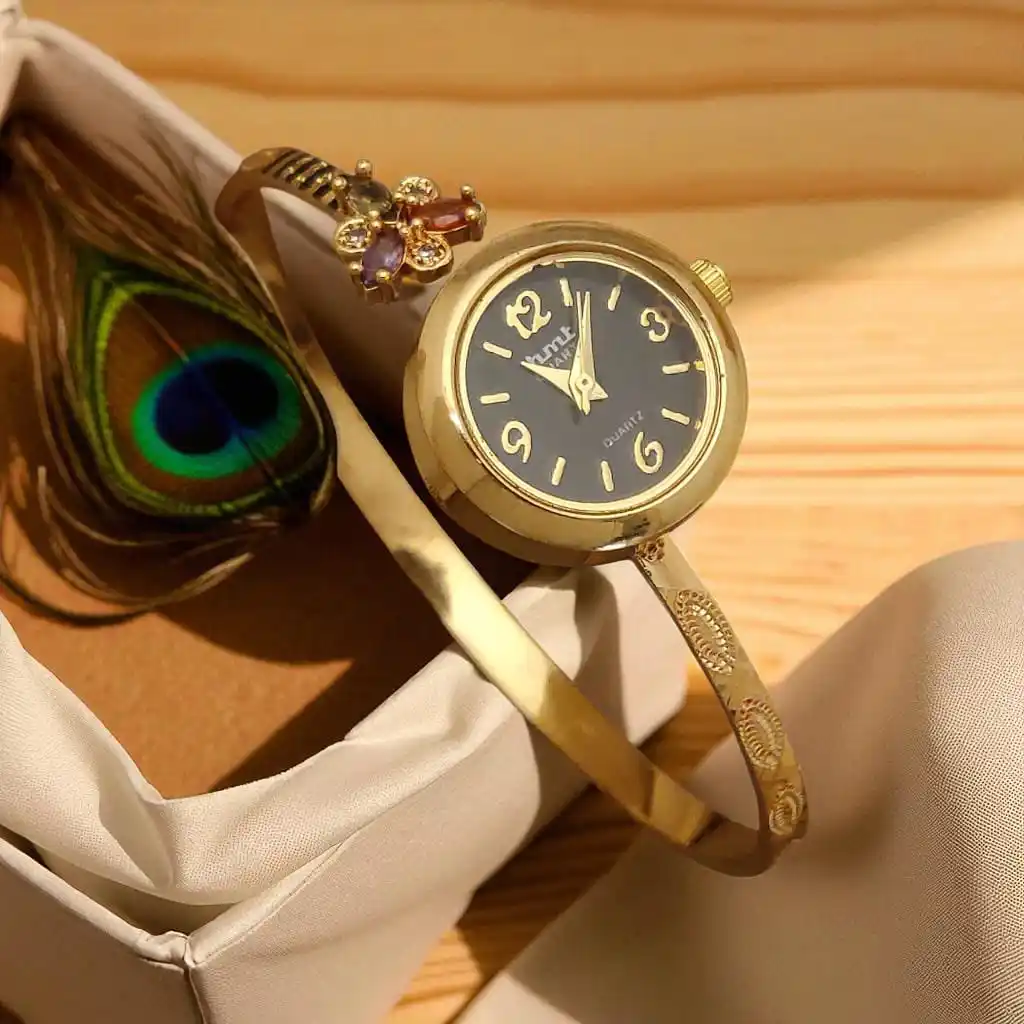 Premium High Gold Plated AD Diamond Studded Flower Adjustable Black Watch for Women
