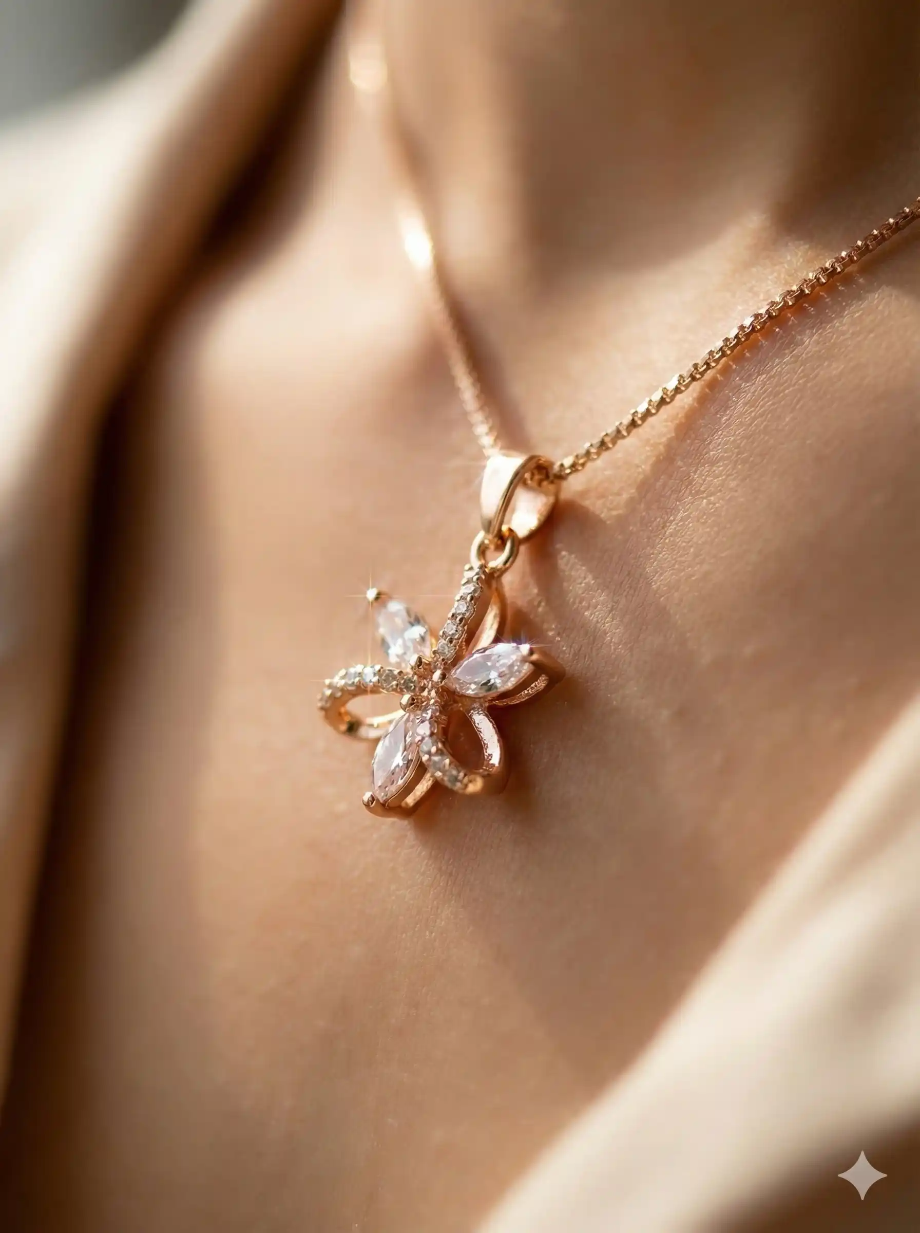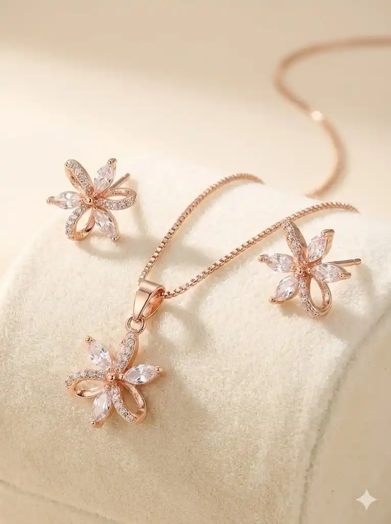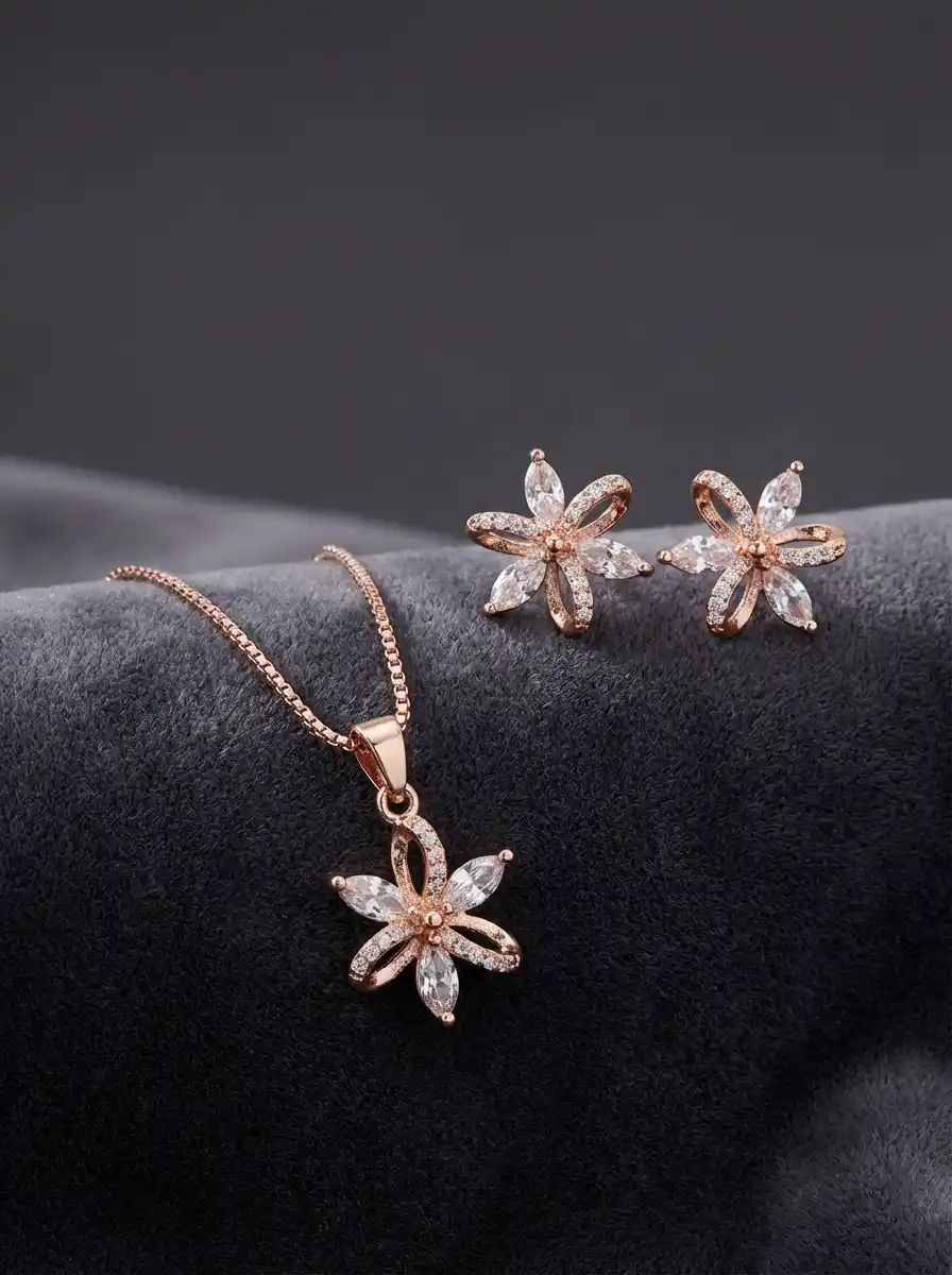 rose gold plated ad dimaond studed fancy flower pendent set with short chain